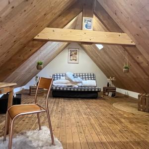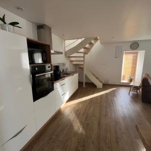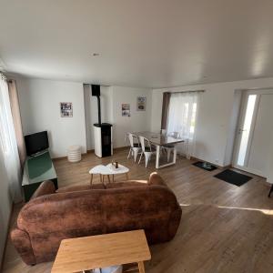 Séjour avec cuisine ouverte équipée (éléments hauts et bas, plaque de cuisson, hotte, four, réfrigérateur) avec poêle à granulés 30 m², dégagement (coin bureau) wc, buanderie,