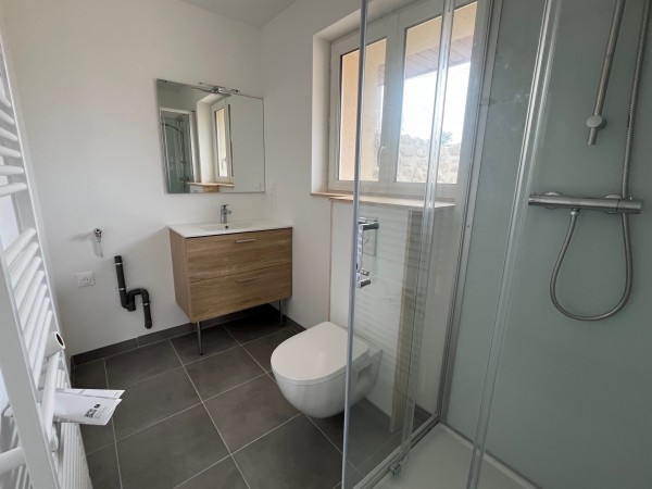 1) Une maison de plain pied couverte en ardoises, comprenant séjour avec cuisine ouverte équipée 20 m², une chambre 10 m², salle de douches avec wc,