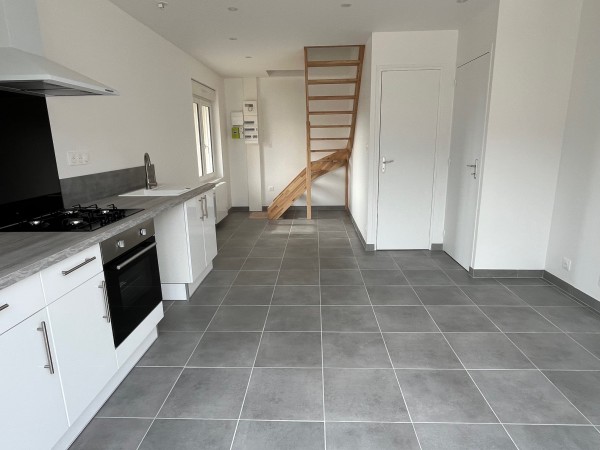 2) Une maison couverte en ardoises comprenant séjour avec cuisine ouverte équipée 20 m² et départ d'escalier bois, salle de douches avec wc, à l'étage une chambre mansardée, placard