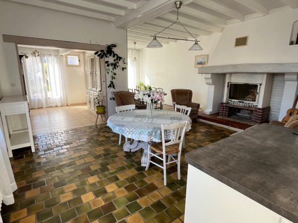 Entrée avec départ d'escalier, séjour / salon avec cheminée et cuisine ouverte 45 m², une chambre 14 m², salle de douches wc,