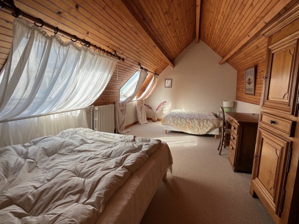 A l'étage une chambre mansardée 18 m², deux chambres en enfilades 12 m² et 13 m², wc,